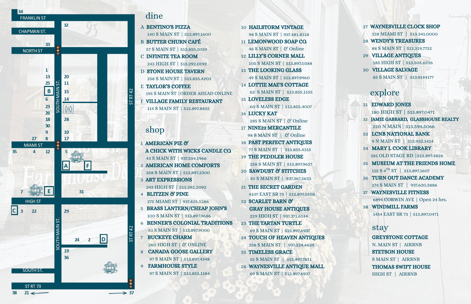 Just a short drive off the interstate at the Route 73 exit, conveniently tucked between I-71 and I-75, north of Cincinnati and south of Columbus. Waynesville welcomes you with more than 60 independently owned shops and restaurants. Each one is a chapter of its own, offering treasures both old and new, thoughtfully curated and full of heart.